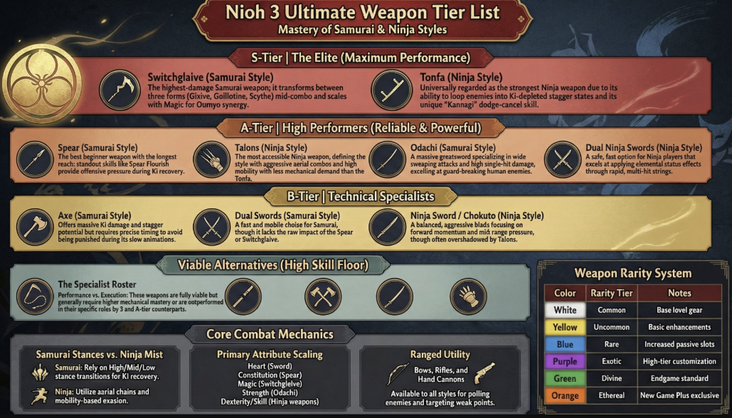 For a full cross-style ranking of all 14 weapons including Ninja options, see our Nioh 3 Best Weapons Tier List. For the stat investment logic behind each weapon, our Nioh 3 Weapons Scaling Guide covers every Reference Stat combination in detail.