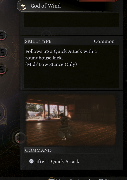 - Cyclone Wind — Spinning multi-hit attack that connects stance transitions. The core of every combo loop. Learn this first.