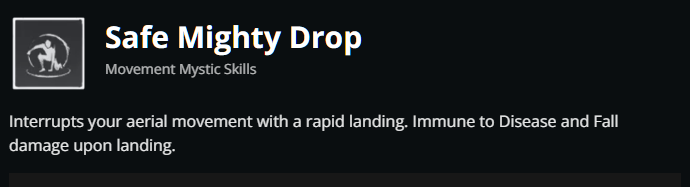 Safe Mighty Drop thuộc nhóm Movement Mystic Skills (Thân Pháp, Bộ Pháp và Khinh Công) thiên về thân pháp. Khác với Mighty Drop – tập trung vào việc rơi xuống nhanh – phiên bản “Safe” nhấn mạnh vào an thân, giúp người chơi hủy đà rơi một cách mượt mà, triệt tiêu toàn bộ lực va chạm khi tiếp đất.